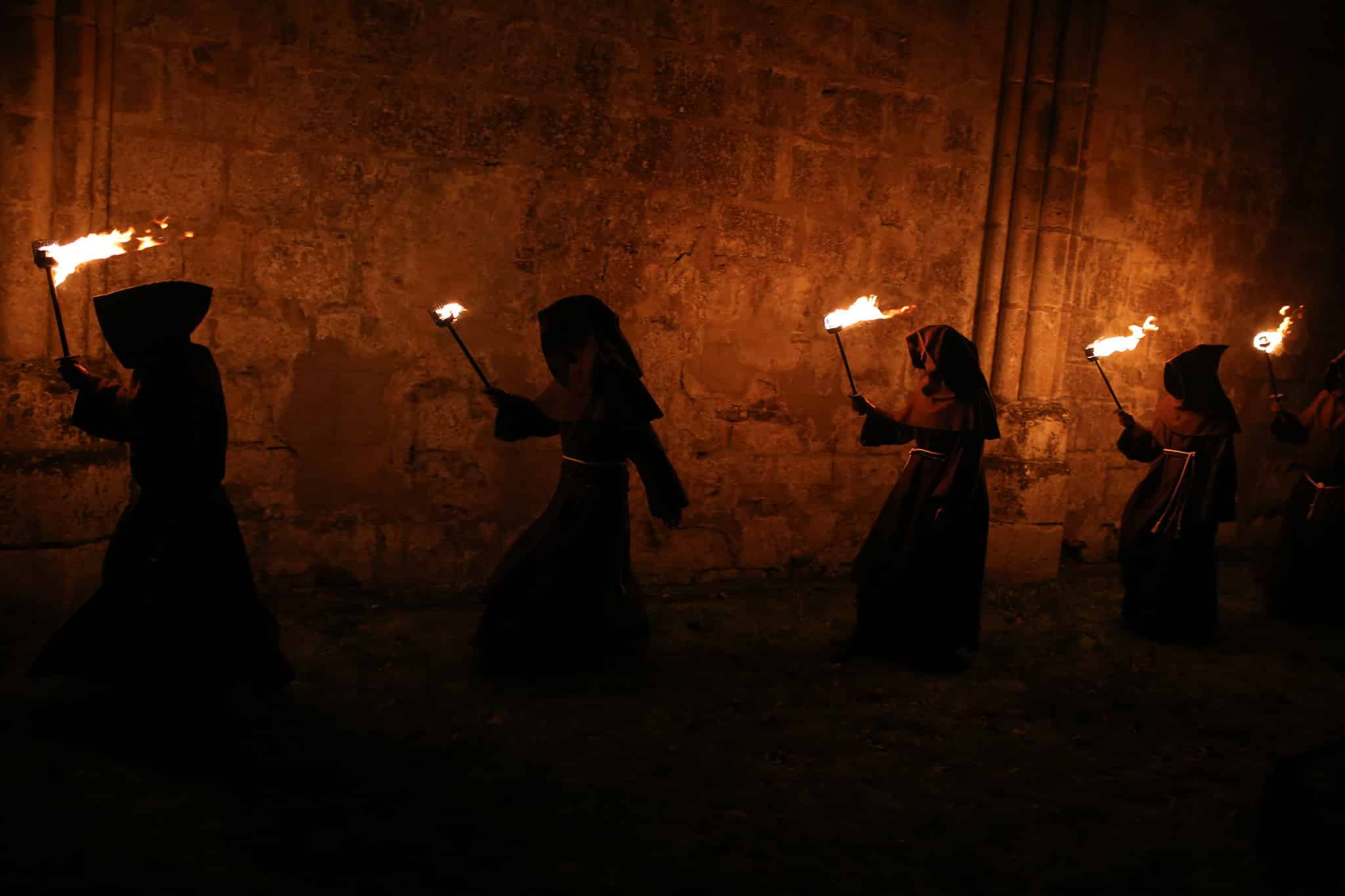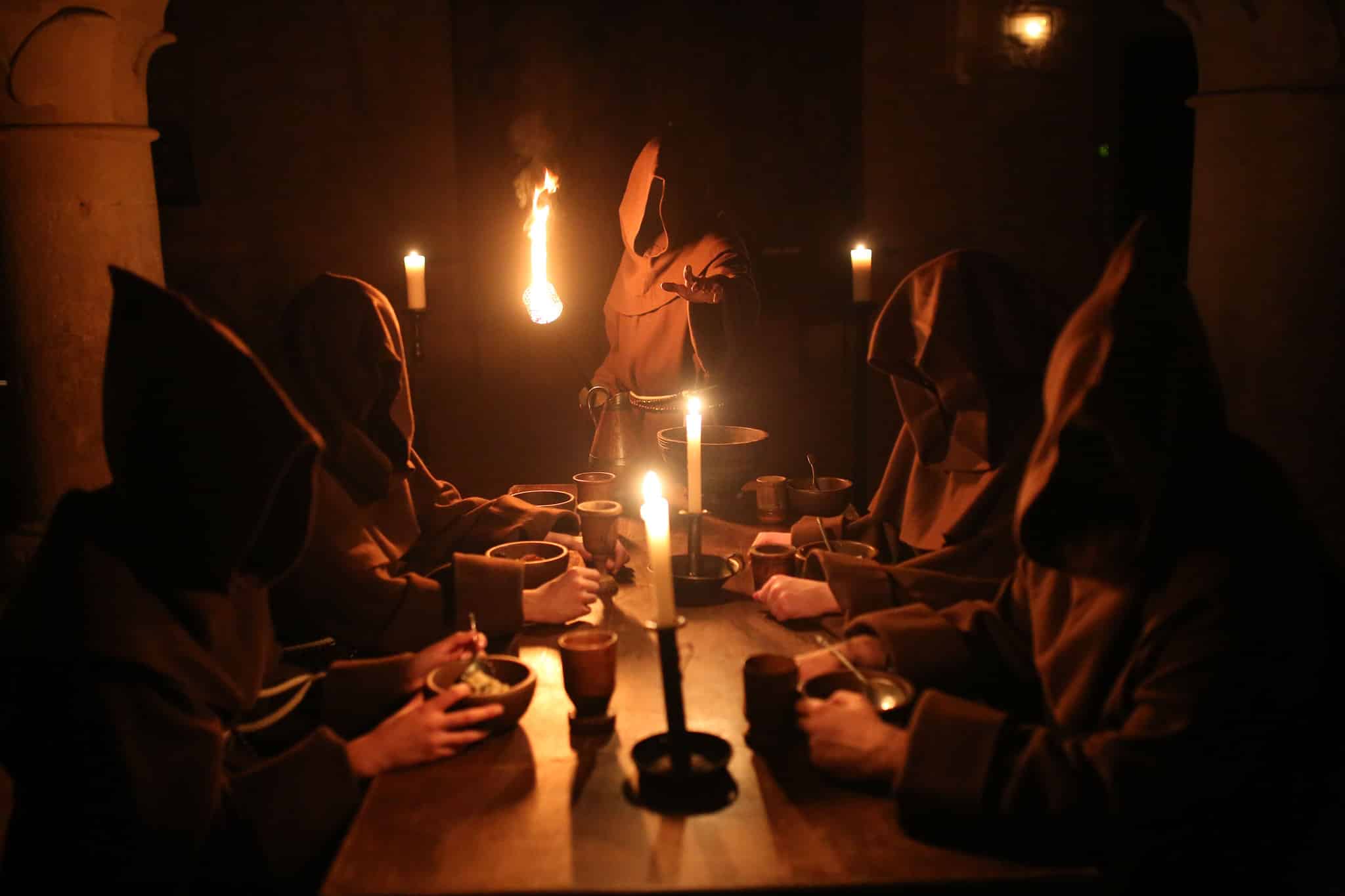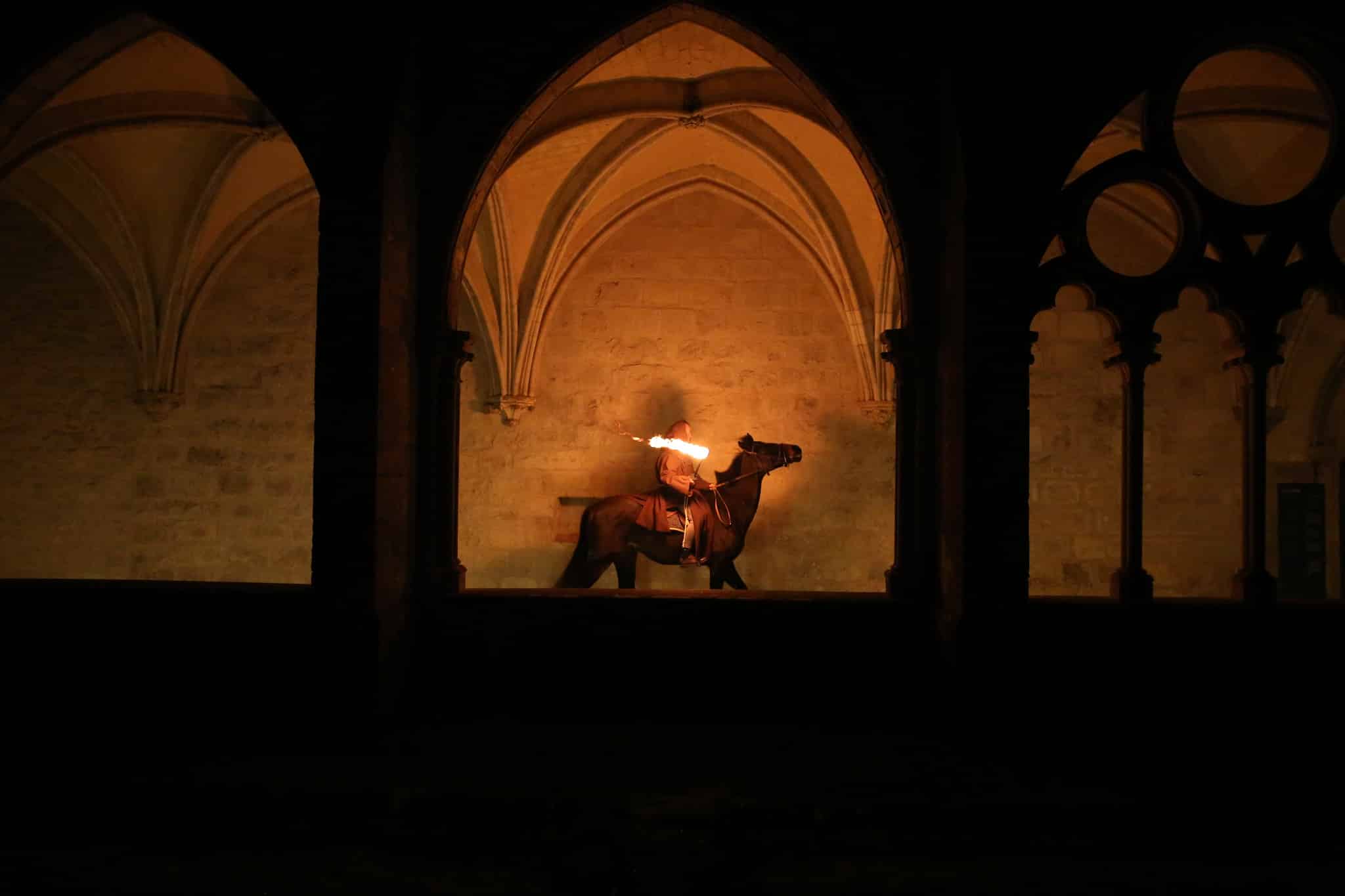 The teaser highlights an ancient abbey shrouded in mystery: riding through the woods, exploring by torchlight, a monastic banquet, and a signal fire in the ancient ruins. A mystical atmosphere unfolds throughout the images, revealing an enigmatic prophecy and a fascinating procession.