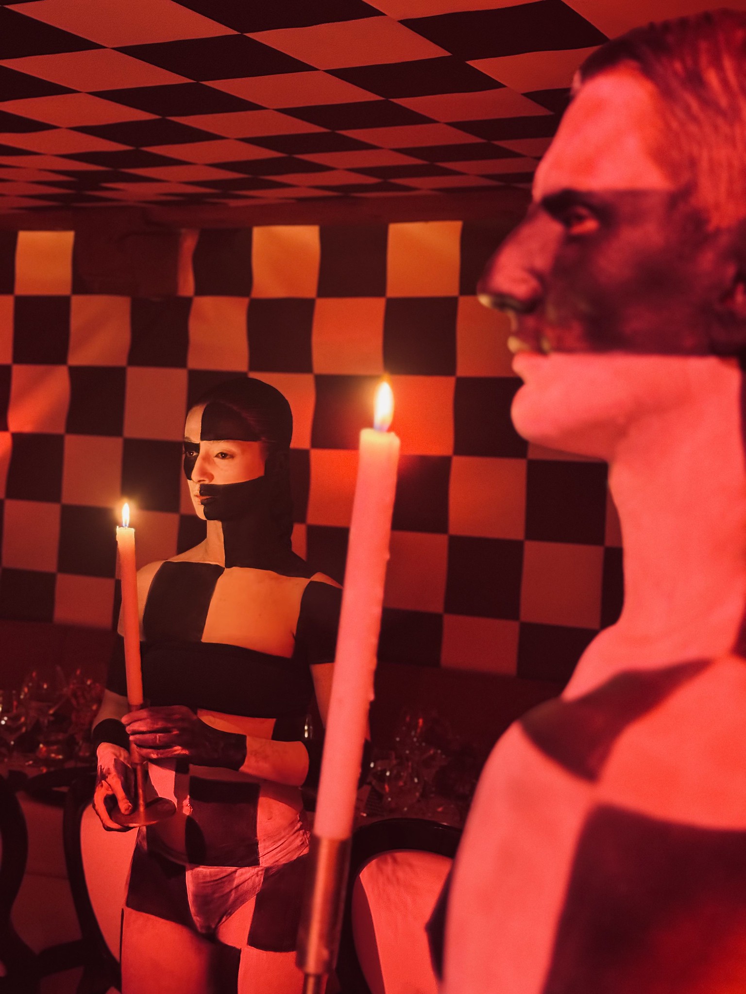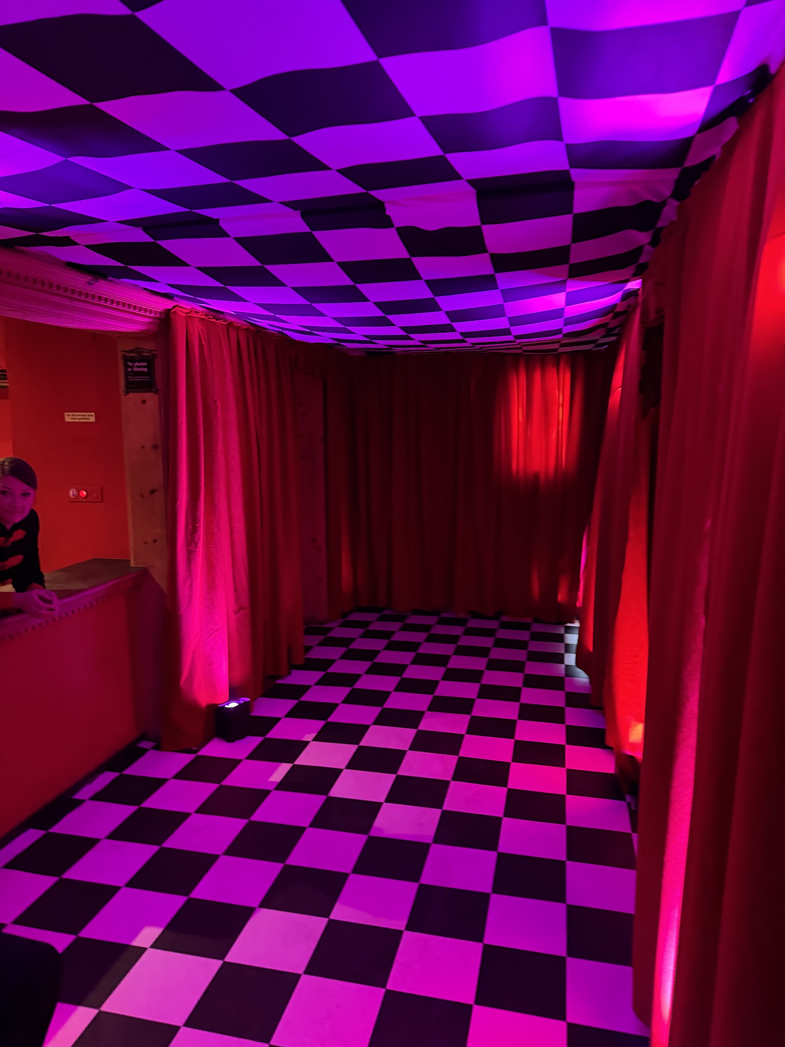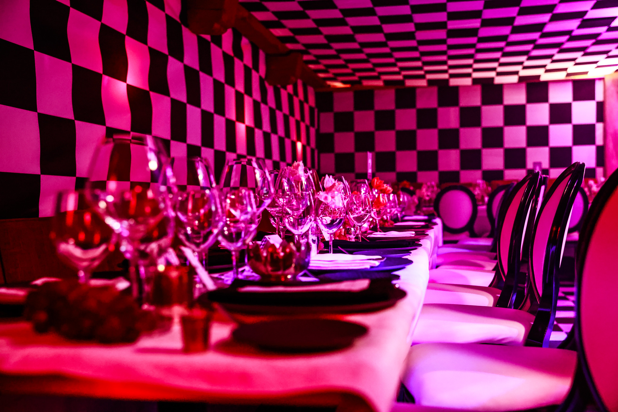 - Transformation de la salle à manger en un damier infini, mur, sol, plafond pour créer une illusion d’optique parfaite